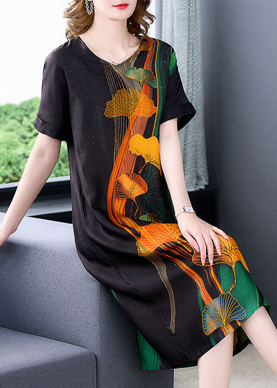 Unique Black Green O-Neck Floral Print Silk Vacation Dresses Short Sleeve
