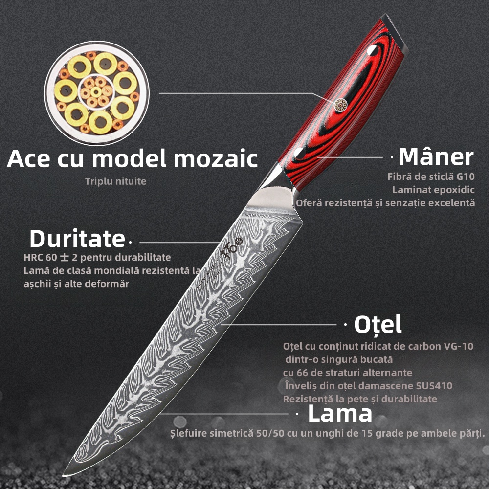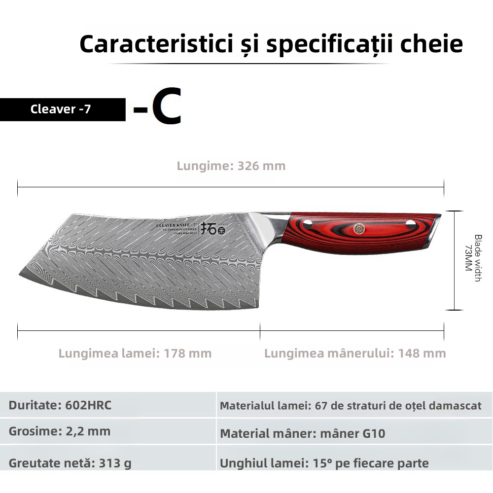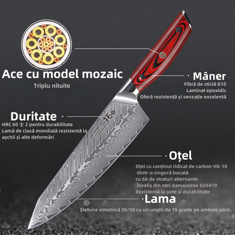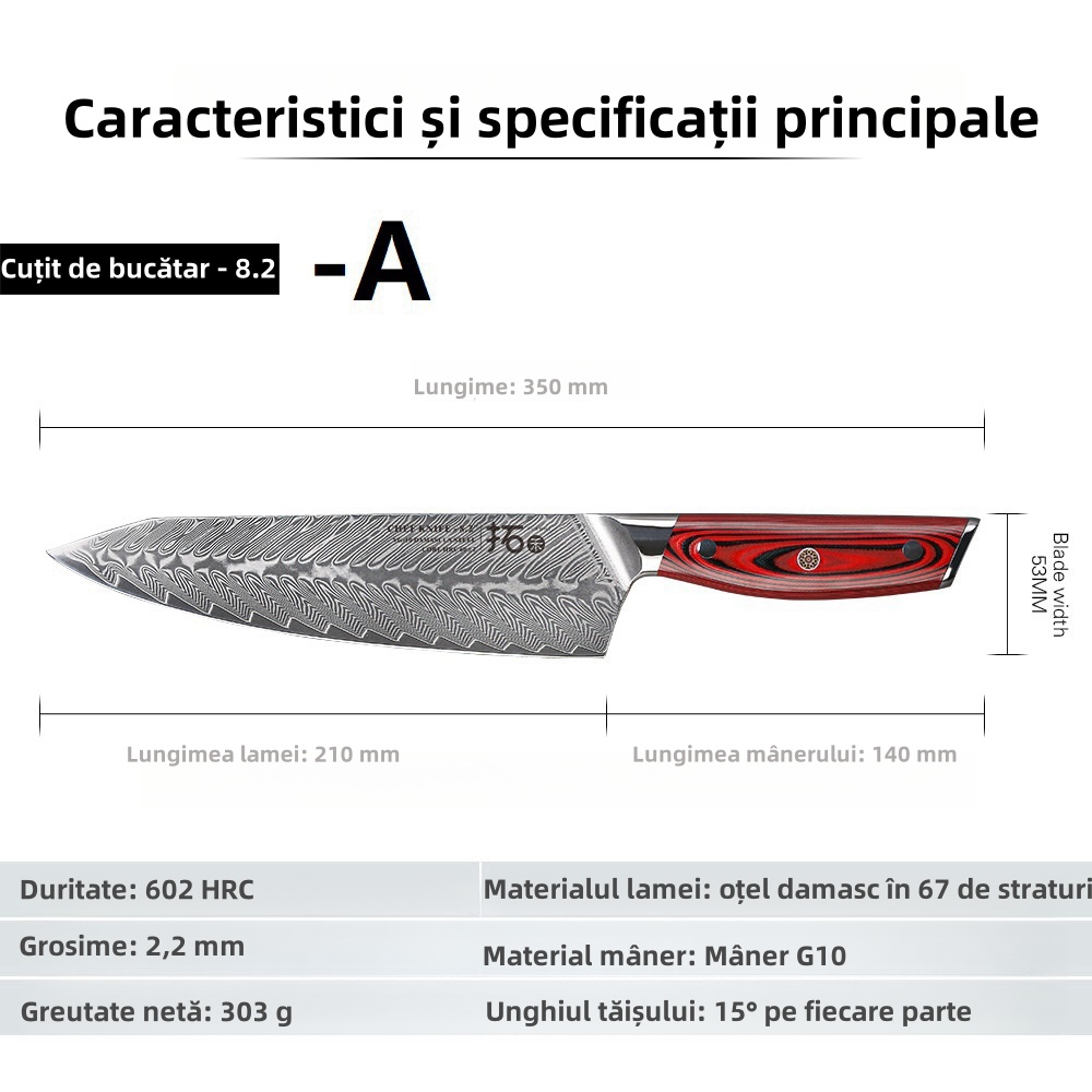 Caracteristicile produsului: Fiecare cuțit este realizat cu atenție de meșteri pricepuți, cu o măiestrie rafinată, folosind un tratament termic de răcire profundă cu vid, ușor, ascuțit și durabil, extrem de rezistent la rugină, modelul Damasc în țesătură de hering îmbunătățește rezistența la pete și previne lipirea alimentelor de lamă. , lama este conică pentru un plus de ascuțire. Manerul este durabil, antiderapant, usor de curatat, frumos si ofera control maxim cu o forta minima. Durabilitatea și echilibrul bun combinate cu rezistența la coroziune și un model elegant de Damasc fac din cuțit un instrument demn pentru profesioniști.Material produs: oțel Damasc japonez de înaltă calitate cu 67 de straturi și material de bază din oțel VG-10, mânerul G-10 de calitate ultra-înaltă are o durabilitate militară și nu se va micșora sau decolora. Reduce oboseala, amorțeala și durerea chiar și după utilizare prelungită.