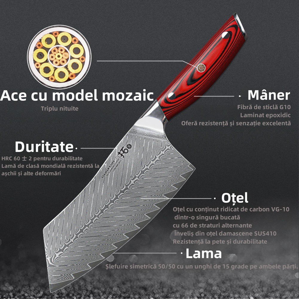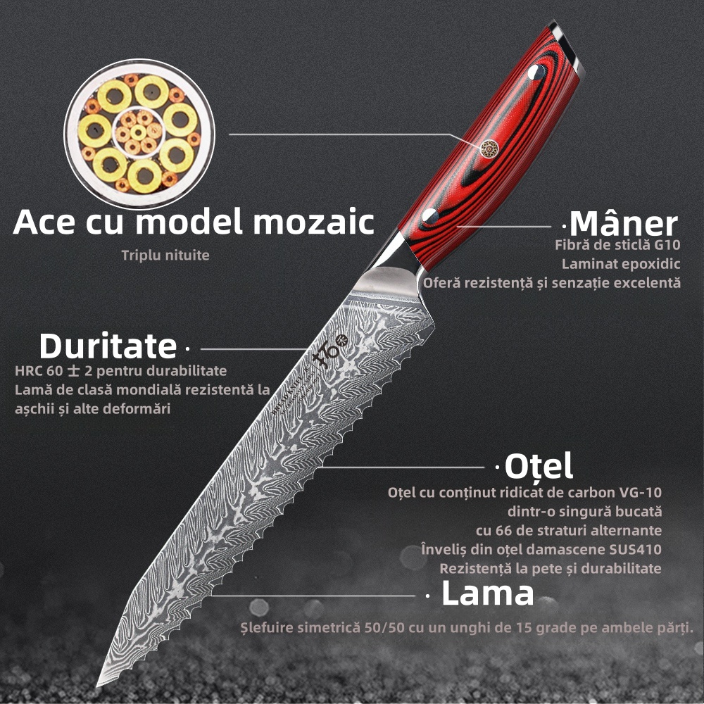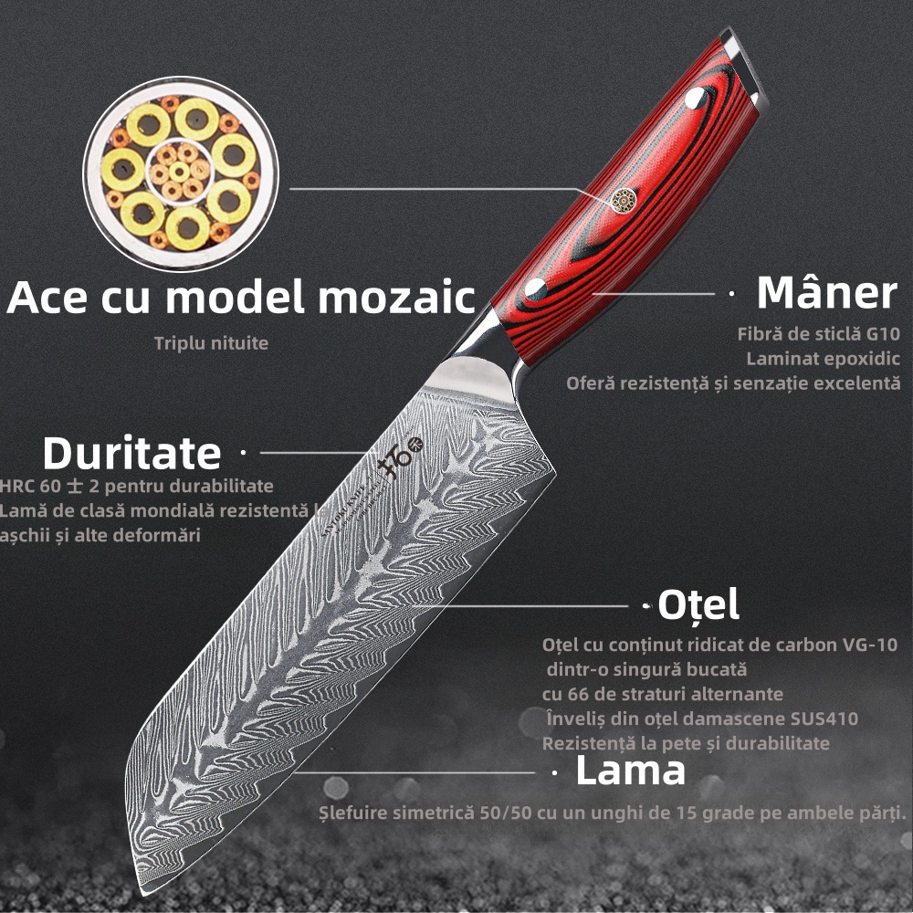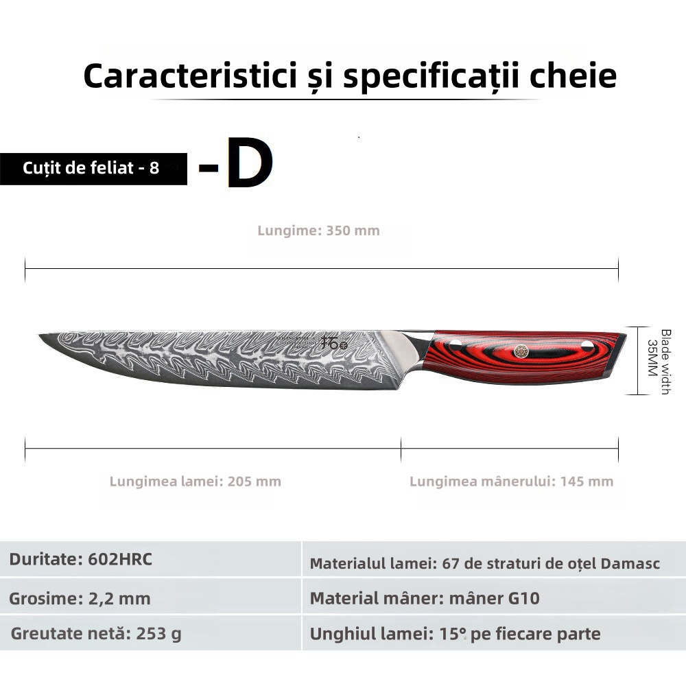 Caracteristicile produsului: Fiecare cuțit este realizat cu atenție de meșteri pricepuți, cu o măiestrie rafinată, folosind un tratament termic de răcire profundă cu vid, ușor, ascuțit și durabil, extrem de rezistent la rugină, modelul Damasc în țesătură de hering îmbunătățește rezistența la pete și previne lipirea alimentelor de lamă. , lama este conică pentru un plus de ascuțire. Manerul este durabil, antiderapant, usor de curatat, frumos si ofera control maxim cu o forta minima. Durabilitatea și echilibrul bun combinate cu rezistența la coroziune și un model elegant de Damasc fac din cuțit un instrument demn pentru profesioniști.Material produs: oțel Damasc japonez de înaltă calitate cu 67 de straturi și material de bază din oțel VG-10, mânerul G-10 de calitate ultra-înaltă are o durabilitate militară și nu se va micșora sau decolora. Reduce oboseala, amorțeala și durerea chiar și după utilizare prelungită.