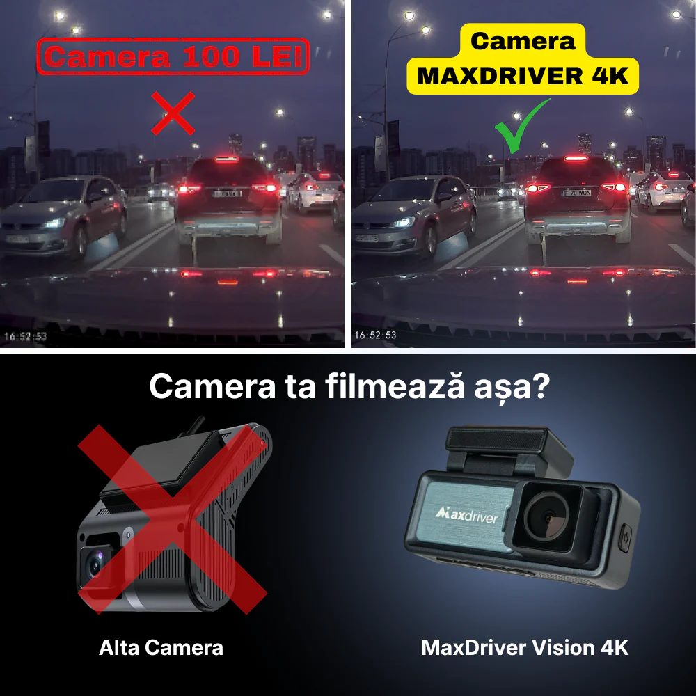 Detalii care pot face diferența: imaginea 4K Ultra HD surprinde tot — numere de înmatriculare, semne rutiere, fețe sau mișcări din trafic. Spre deosebire de camerele slabe (720p), Max Driver Vision Ultra oferă dovezi clare, utile în orice situație.