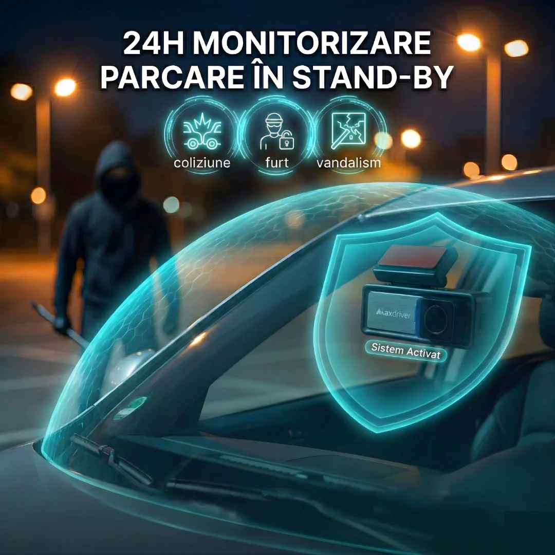 Camera intră în standby când motorul e oprit și se activează automat la mișcare, pentru a surprinde tentative de furt, coliziuni sau vandalism.