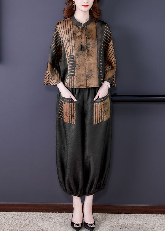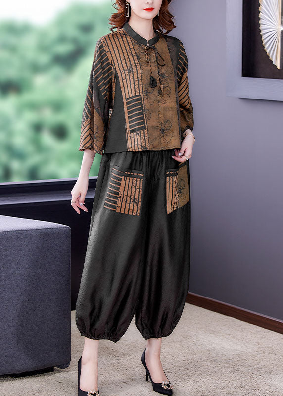 Casual Coffee Stand Collar Patchwork Print Silk Two Pieces Set Bracelet Sleeve
