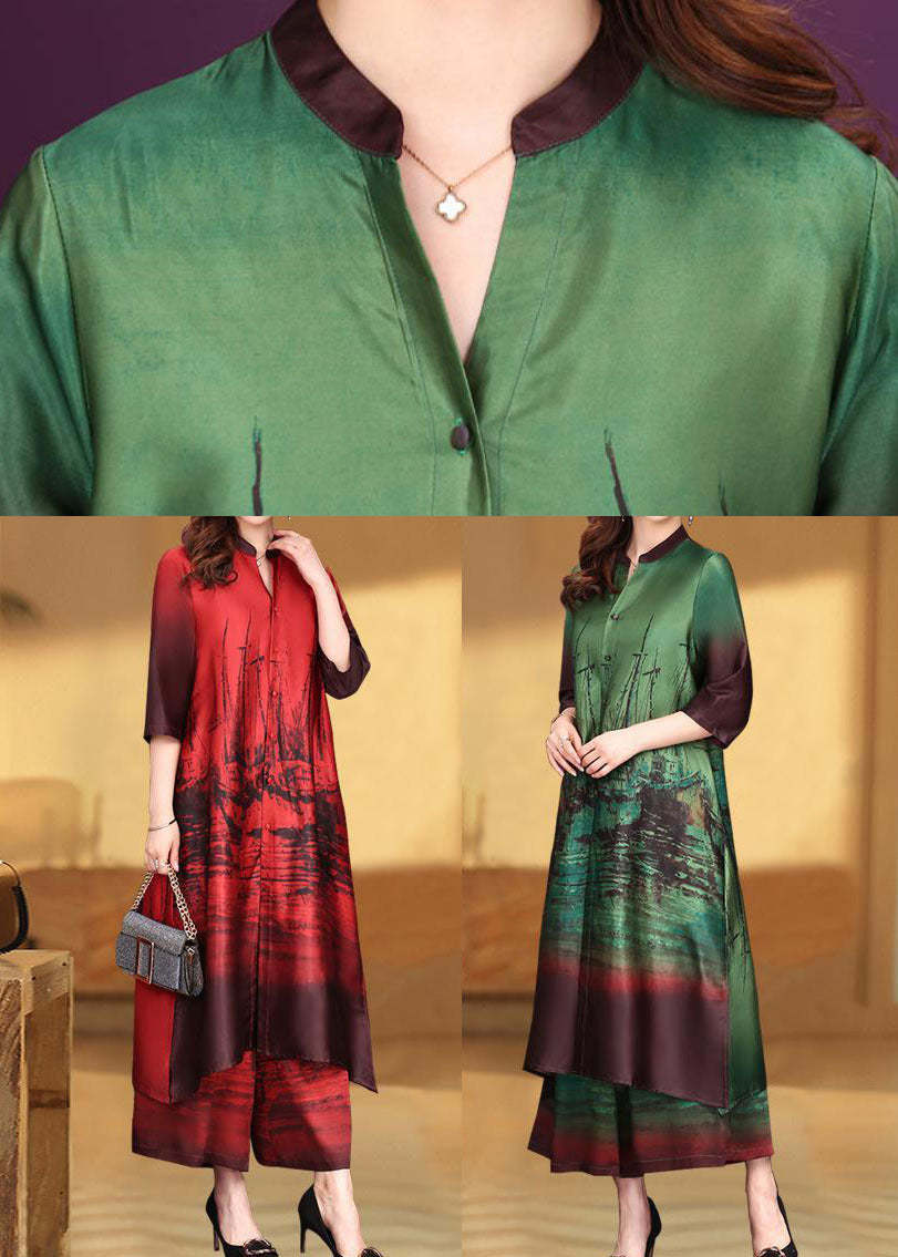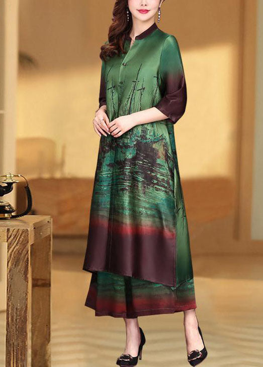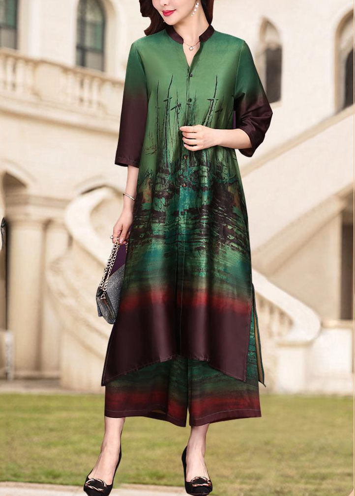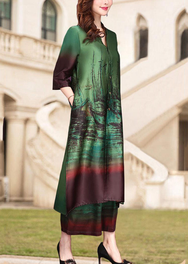 Green Print Silk Two Pieces Set V Neck Side Open Half Sleeve