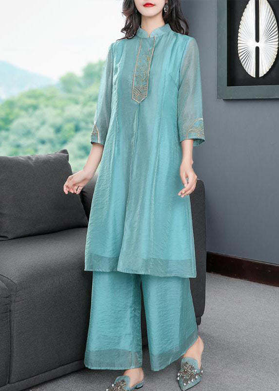 Modern Light Blue Embroideried Side Open Silk Two Piece Set Bracelet Sleeve <SHIPPING IN 30 DAYS>
