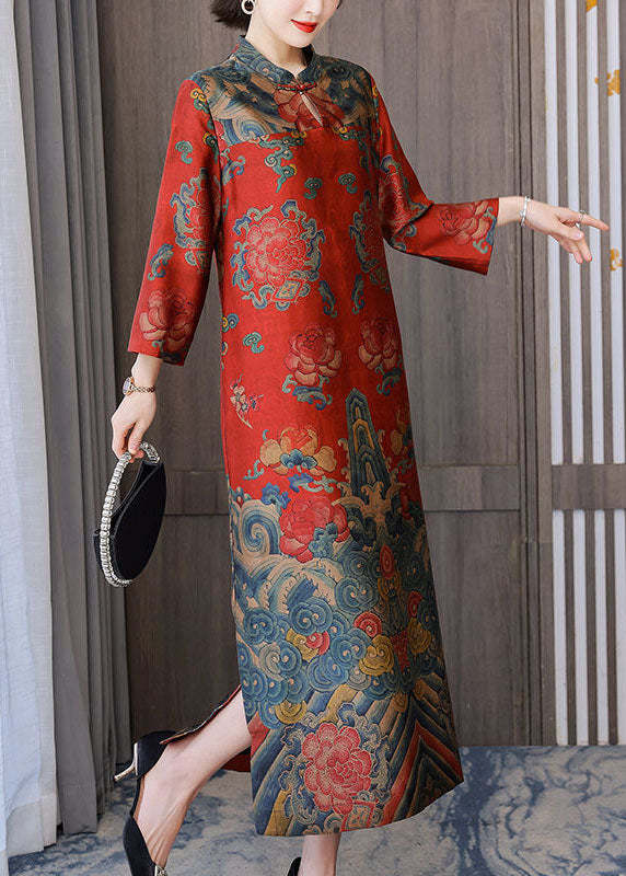 Red Chinese Style Silk Dresses Stand Collar Side Open Bracelet Sleeve