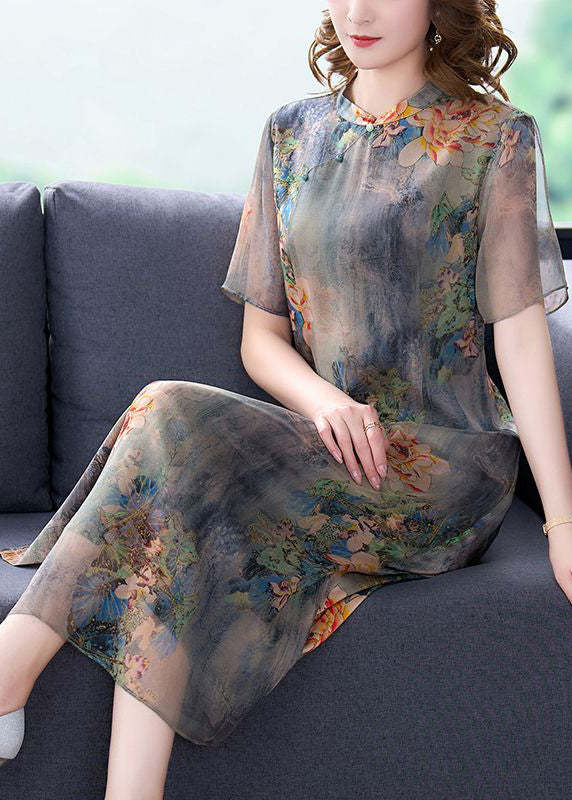 Women Light Grey Stand Collar Tie Dye Print Slim Fit Silk Dress Summer